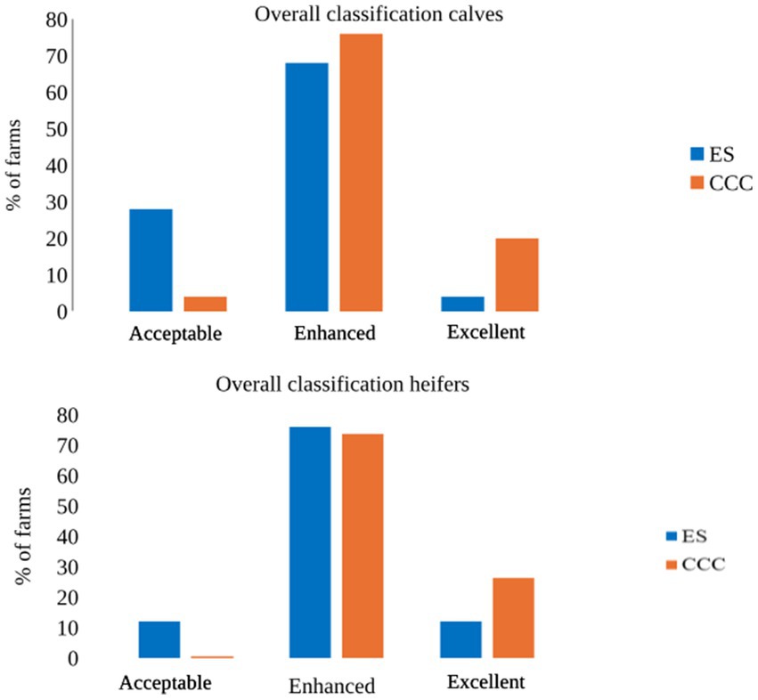 In fact, 20% of CCC farms achieved an “excellent” welfare classification for calves and 32% for heifers, compared to 4% and 8% of ES farms, respectively.